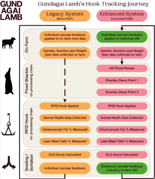 From last month, it has provided enhanced individual carcase feedback by linking it to on-farm EID ear tags on lambs; the first Australian lamb processor to do this.