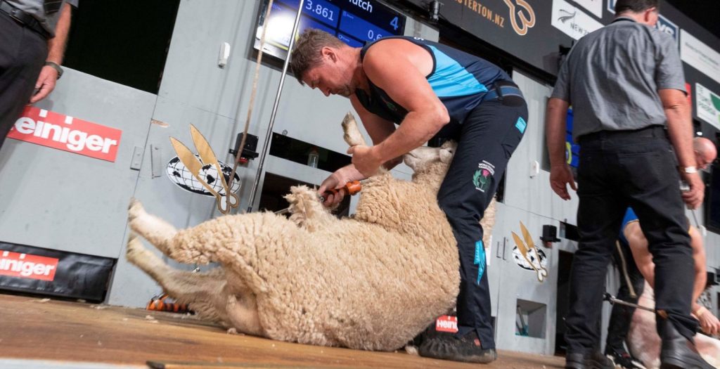 New Zealand-based Scotland international Gavin Mutch, the top qualifier for the World machine shearing semi-final, chasing a second win in the event. Photo – Golden Shears.